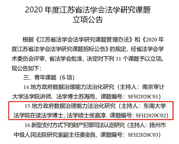 2020年7月31日,江苏省法学会发布了《2020年度江苏省法学会法学研究课题立项公告》,2020年度江苏省法学会法学研究课题分为重点课题、一般课题、青年课题、自选课题,现经省法学会学术委员会评审、省法学会批准,对31个课题予以立项,其中必赢博士生侯嘉淳主持的《地方政府数据治理能力法治化研究》荣获青年课题立项。
