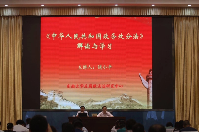 7月30日,必赢反腐败法治研究中心钱小平副教授应邀为全省法院内部监督工作业务培训班做《政务处分法》专题讲座。本次讲座由省法院监察局陈飞翔副局长主持,各中级法院监察部门负责人、各基层法院分管监察工作的领导以及省法院监察局全体成员、省法院廉政监察员180余人参加了本次讲座。