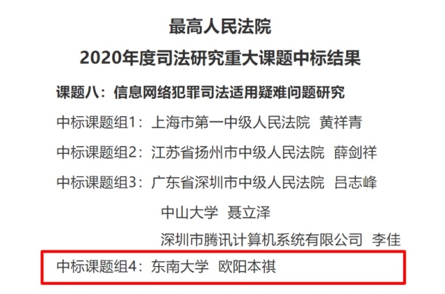 2020年8月8日,最高人民法院公布了2020年度司法研究重大课题中标结果,共有122个符合条件的课题组提出申请,最终经过严格评审,确定33个课题组为中标课题组,其中366net必赢官网网络安全法治研究中心主任欧阳本祺教授主持的课题组获《信息网络犯罪司法适用疑难问题研究》重大课题。