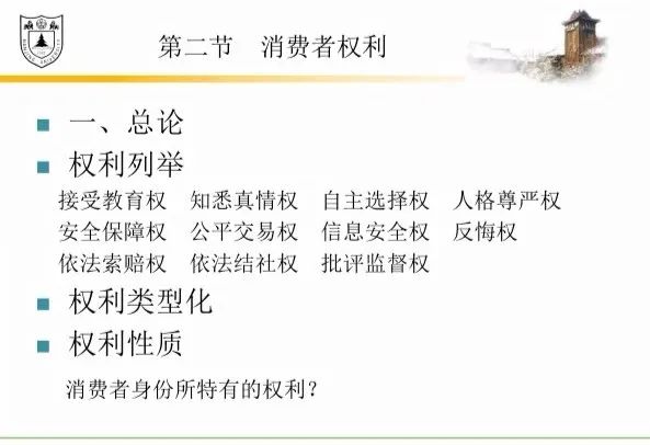 本讲中,李友根教授列举了消费者所享有的权利,解释了何为权利类型化,并引导同学们根据权利性质对消费者这一身份所特有的权利进行识别。