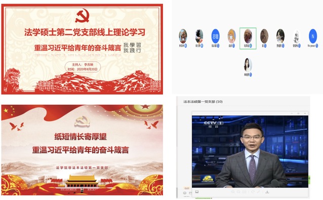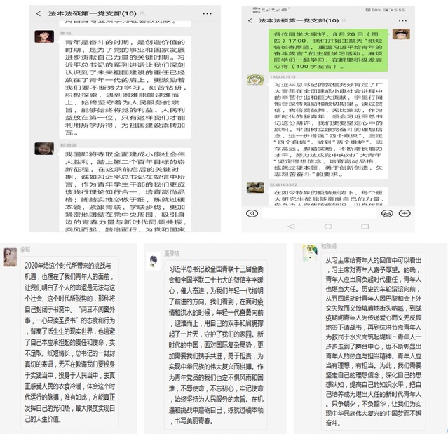 8月19日-8月21日,366net必赢官网硕士和博士党支部在支部书记的组织下共同阅读贺信并学习习近平总书记的贺信精神,支部党员在学习后踊跃分享了学习的心得体会。法学硕士第一支部支部书记王野同志认为,2020年注定是不平凡的一年,疫情与洪灾不断磨练着青年党员的意志,锻炼着青年党员的本领。当前全国抗击疫情取得了阶段性胜利,进一步激发了广大青年党员参与到建设中国特色社会主义事业的热情与斗志。青年党员既是中华民族全面建成小康社会,彻底摆脱贫困的见证者,也是实现全面中华民族伟大复兴的参与者。法学硕士第二党支部支部书记李吉映分享了在当下工作就业、疫情危机等压力之下,青年党员要有“乱云飞渡仍从容”的自信与豪迈,练就过硬的本领,书写无愧于时代的青春华章。支部委员陆泉旭认为青年人需要有良好的作息,积极锻炼身体,练就强健体魄。其他党员与积极分子们也积极踊跃发言,分别从抗疫抗洪、校园生活、就业等方面切实的谈了自身的学习看法,并就习总书记的殷切希望表达了直挂云帆的信心与决心。法本法硕第一党支部党支部副书记陈娜娜指出,青年要保持初生牛犊不怕虎、越是艰险越向前的刚健勇毅,勇立时代潮头,争做时代先锋。法学硕士第三支部成员从我国近年来发展和今年抗击疫情中青年人发挥的作用中讨论何为青年人的本色和担当。366net必赢官网博士生党支部部分党员结合了法学专业谈了自己如何才能不负习近平总书记对广大青年的期望。非法本法硕第一党支部和第二党支部共28党员也就如何将个人的前途理想同中华民族伟大复兴的中国梦相结合分享了心得体会。