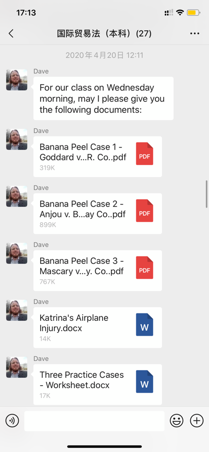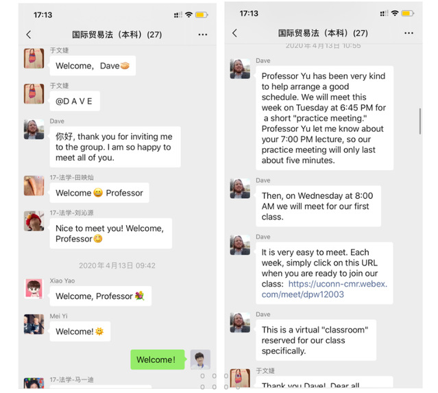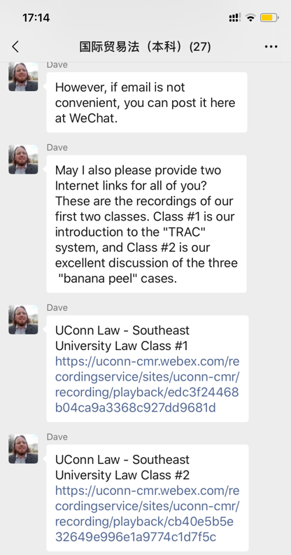 得知外教的加入,同学们内心喜悦又忐忑,虽然先前已有过全英文上课的经历,但与之前的面对面教学模式不同,跨国网课的新模式存在网络、设备、时差等条件限制。David跨国教学经验丰富,在课程微信群中与同学们亲切问好后,对接下来的课程进行了迅速安排。开课前,David通知同学们将采用Webex软件进行授课,并通过自我介绍的视频与大家提前“面对面”相见。开课前一天,David引导全体同学进行网络和设备测试,确保同学们都能够正常进入云教室。一切就绪后,第一堂跨国《国际贸易法》如期而至。