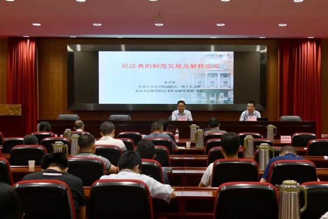 会议邀请了366net必赢官网副院长、博士生导师、366net必赢官网民事检察基地主任单平基副教授进行辅导讲授。单平基副教授以“民法典的制度发展及解释运用”为题,从民法典的基本体例、民法典的基本内容等方面进行了专业解读。单平基副教授讲授语言风趣幽默、案例结合紧密分析深入浅出,给大家上了一堂生动的法治教育课。