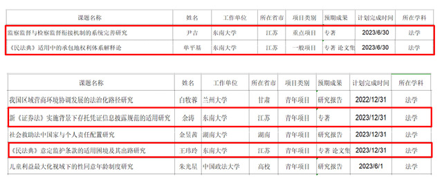 在2020年国家社科基金青年项目中,余涛老师主持的《新<证券法>实施背景下存托凭证信息披露规范的适用研究》和王玮玲老师支持的《<民法典>意定监护条款的适用困境及其出路研究》获青年项目。