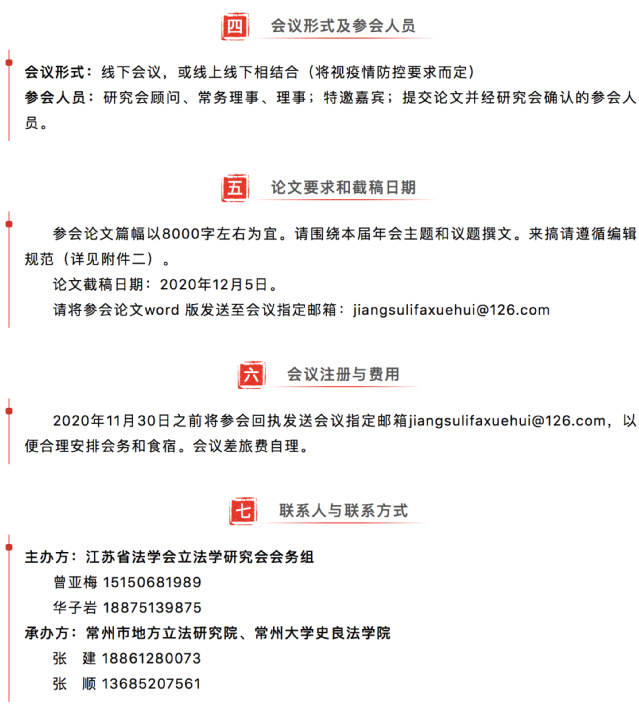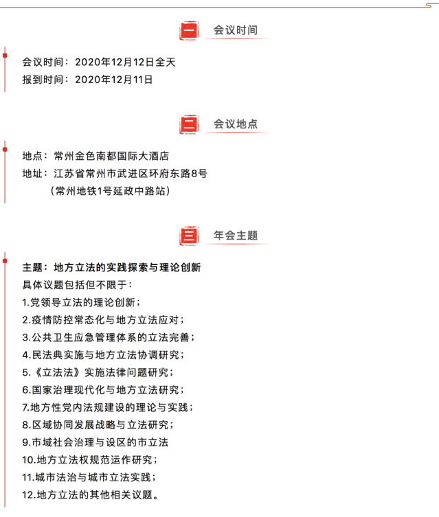 江苏省法学会立法学研究会2020年年会预通知 为繁荣江苏省立法学研究,推进我省立法实践发展,促进立法学理论与实务交流,根据江苏省法学会统一部署,兹定于2020年12月12日在常州市召开“江苏省法学会立法学研究会2020年学术年会”。 本届会议的主题为“地方立法的实践探索与理论创新”,会议由江苏省法学会立法学研究会主办,常州市地方立法研究院、常州大学史良366net必赢官网366net必赢官网承办。现将有关事项通知如下: