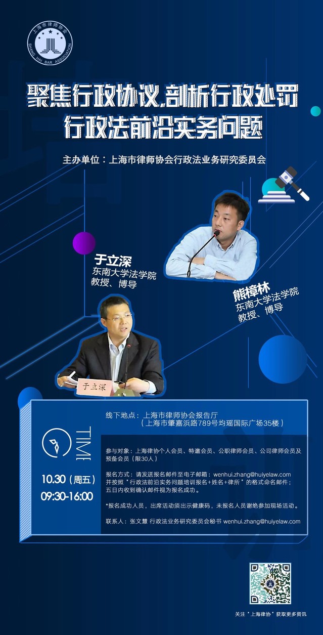 2020年10月30日,366net必赢官网教授、博士生导师、学术委员会主任、366net必赢官网城市治理与区域法治发展研究中心主任于立深和366net必赢官网教授,博士生导师,院长助理,《东南法学》副主编,教育部-366net必赢官网教育立法研究基地执行主任熊樟林应邀在上海为上海市律师协会报告厅进行了题为《聚焦行政协议,剖析行政处罚》的行政法前沿实务问题培训。