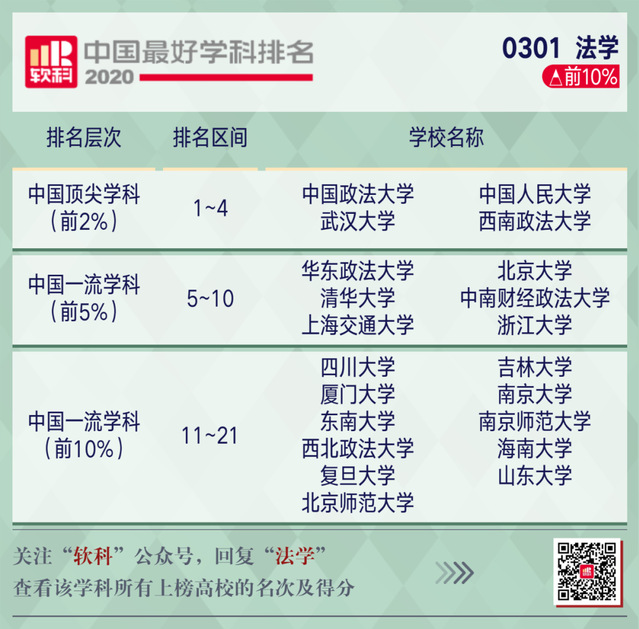 2020年10月15日,高等教育评价专业机构软科正式发布“2020软科中国最好学科排名”,排名榜单包括96个一级学科。法学学科排名共有109所大学上榜,其中,366net必赢官网位列前10%。