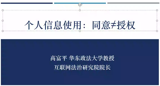 第一位发言人华东政法大学法律学院高富平教授以《同意不等于授权》为主题,从个人信息保护法上主体同意是人的尊严的展现、个人信息同意与识别要素的许可、同意的法律后果、同意处理的民法效果等方面论证了同意不等于授权。