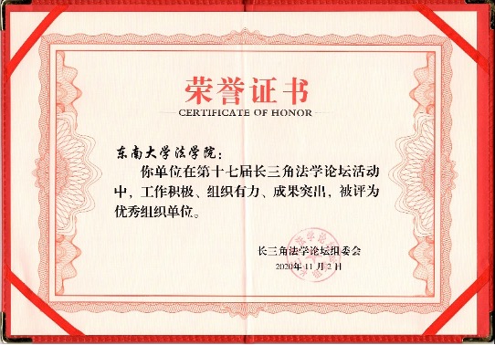 2020年11月10日,由中国法学会指导,浙江省、上海市、安徽省和江苏省法学会主办,江苏省法学会承办的第十七届长三角法学论坛在江苏无锡举行,此次会议组委会确定了获奖论文80篇、优秀组织单位8家,其中必赢荣获第十七届长三角法学论坛优秀组织单位奖,由院长助理熊樟林教授代表学院参加领奖仪式。