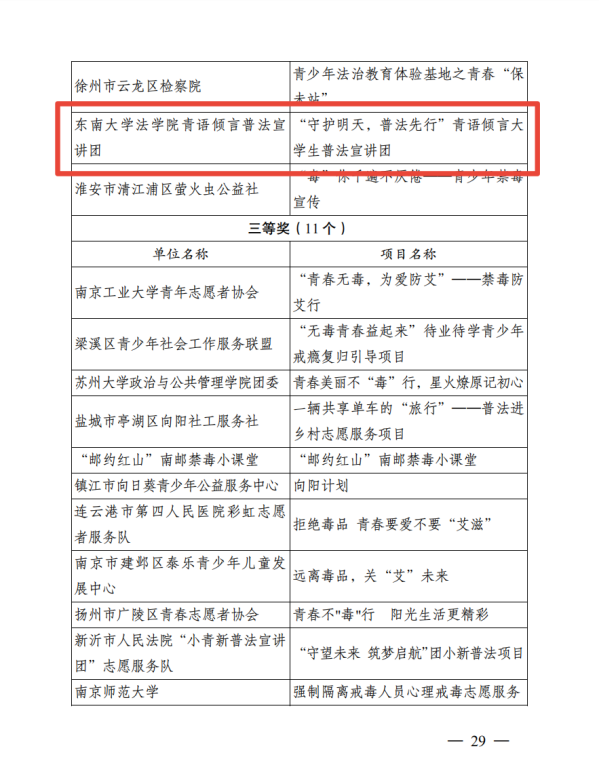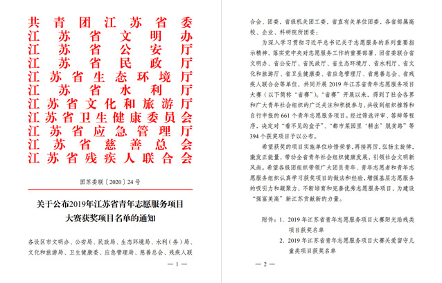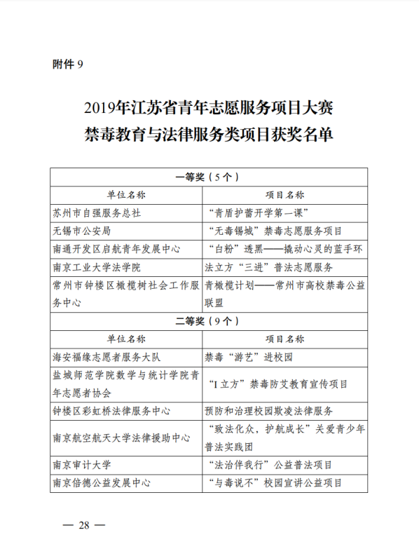 2020年共青团江苏省委办公室印发了2019年江苏省青年志愿服务项目大赛获奖名单,必赢青语倾言普法宣讲团报送的“守护明天,普法先行”项目,获江苏省青年志愿服务项目大赛禁毒教育与法律服务类项目二等奖。