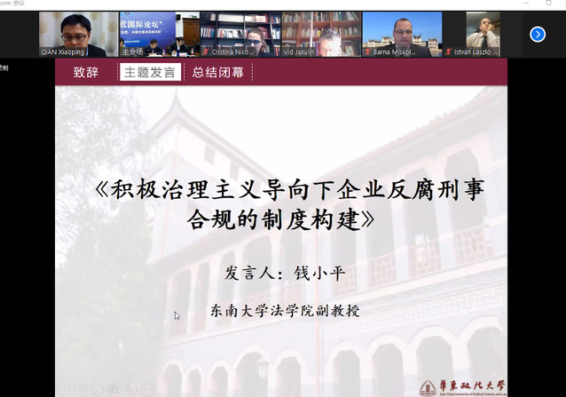 2020年11月28日,由上海社会科学院法学研究所与华东政法大学联合主办的第七届“中欧国际论坛”在上海召开。来自匈牙利总检察长办公室、塞尔维亚外交部、波黑财政部以及匈牙利佩奇大学、罗马尼亚西蒂米什瓦拉大学、克罗地亚奥西耶克大学、塞尔维亚诺维萨德商业大学、斯洛文尼亚卢布尔雅那大学、斯洛文尼亚卢布尔雅那大学的12位外方专家以及来自中国社科院、上海社科院、华东政法大学、武汉大学、366net必赢官网、北京师范大学、中央财经大学等单位六十多位学者以线上、线下相结合的方式参加了研讨。本届论坛的主题为“网络时代的经济犯罪治理——中国方案与国际经验”,共分五个议题,分别是:“中国经济刑法立法四十年”、“网络时代的经济犯罪:环境、机制与趋势”、“网络时代经济犯罪的制度应对”、“企业刑事合规与犯罪治理”、“经济犯罪治理的国际经验”。