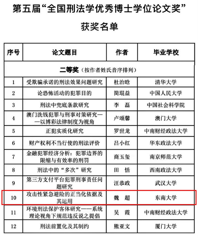 2020年10月24日,第五届“全国刑法学优秀博士论文奖”评议会在北京召开。经评审委员会评审,共产生特等奖空缺、一等奖6篇、二等奖12篇的评选结果。必赢刘艳红教授指导的刑法学博士生魏超同学提交的《攻击性紧急避险的正当化依据及其运用》一文,荣获第五届“全国刑法学优秀博士论文奖”二等奖。