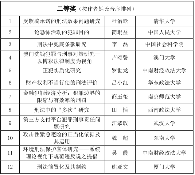 为了保证评奖的公平与公正,中国刑法学研究会特设立第五届“全国刑法学优秀学位论文奖”评审委员会。10月24日,第五届“全国刑法学优秀博士学位论文奖”评审会议在京召开。会议根据《全国刑法学优秀博士学位论文奖评奖规则》,严格遵循科学、公正和宁缺勿滥的原则,以无记名投票的方式评选出获奖博士学位论文18篇(其中特等奖空缺,一等奖6篇,二等奖12篇),现予以公示。