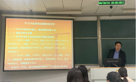 2020年10月14日,曾获“全国优秀公诉人”“全国检察业务专家”等荣誉称号的尹吉教授为同学们讲授“检察官职业伦理与实践”课程。授课伊始,尹吉教授结合其担任检察长期间的经历,从学做合格的司法人员、就业行情和司法人员违法违纪的现状三个方面,向同学们强调了司法职业道德的重要性。接着,尹吉教授从检察制度的起源与发展讲起,为同学们概括梳理了人民检察制度的特色、基本原则、检察人员职业道德的概念与特征,最后总结出检察官职业所必须遵守的六项内容。