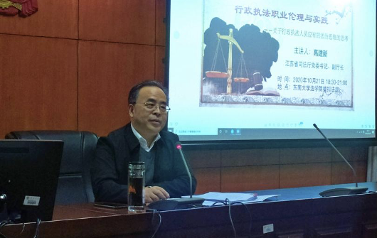 2020年10月21日,江苏省司法厅党委书记、副厅长高建新教授,以“关于行政执法人员应有的法治思维的思考”为题,向同学们讲授行政执法过程中遇到的难题和应当遵守的法律职业伦理。高建新教授列举了我国国家治理中的三点现象:偏重执法、改革与立法有间隔、规则与现实制度差异较大。高建新教授从现象出发,指出行政法和行政解释发展的重要性,并强调行政法的学习要聚焦于行政权运行的真实过程。