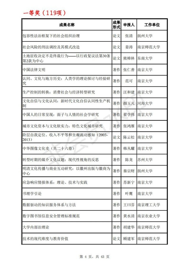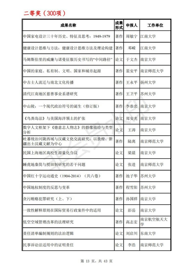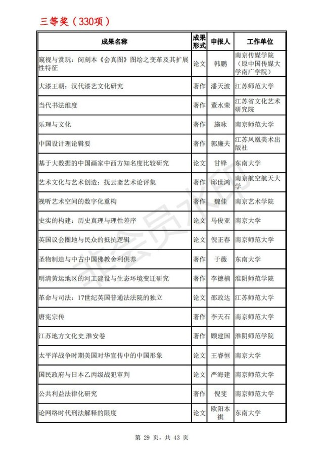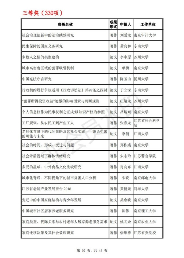 江苏省第十六届哲学社会科学优秀成果奖评审工作已经结束。经省评奖工作领导小组会议审定,拟获奖成果749项,其中一等奖119项,二等奖300项,三等奖330项。根据《江苏省哲学社会科学优秀成果奖励办法》规定,现将拟获奖成果向社会公示,公示时间为2020年11月17日至26日。