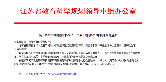 近日,江苏省教育科学“十三五”规划2020年度课题公布,由必赢三位教师领衔主持的三项课题获得省级立项。江苏省教育科学“十三五”规划课题以深入贯彻党的十九大和十九届二中、三中全会精神,全面落实全国教育大会和江苏教育大会精神为引领,以问题为导向,重点围绕立德树人的落实机制、教师队伍建设、劳动教育以及扩大学前教育有效供给、推动教育优质均衡发展、推动高等教育内涵式发展为主体,面向全省教育系统进行课题申报。此次课题申报,体现了必赢教育科研领域的迅速发展,对于推动必赢教学水平的发展具有积极意义。