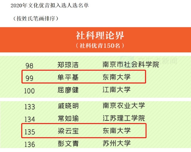 2020年12月31日,江苏省委宣传部公示了2020年江苏省“紫金文化人才培养工程”文化英才、文化优青拟入选人选,公示时间为2020年12月31日至2021年1月6日。必赢单平基副教授与梁云宝副教授拟入选“江苏社科优青”人选名单。
