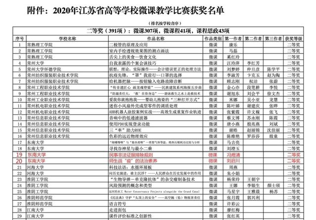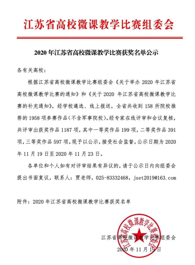 2020年11月19日,江苏省高校微课教学比赛组委会发布《2020年江苏省高校微课教学比赛获奖名单》,根据江苏省高校微课教学比赛组委会《关于举办2020年江苏省高校微课教学比赛的通知》和《关于2020年江苏省高校微课教学比赛的补充通知》,经专家在线评审和会议复核,共评审出获奖作品1187项,其中一等奖作品199项,二等奖作品391项,三等奖作品597项。其中必赢冯煜清副教授、刘启川副教授荣获2020年江苏省高等学校微课教学比赛二等奖。