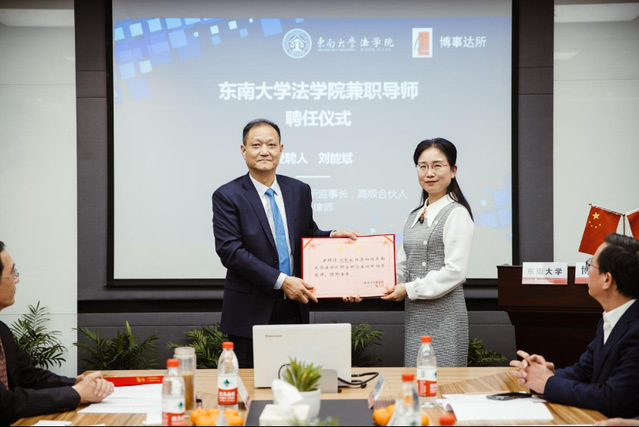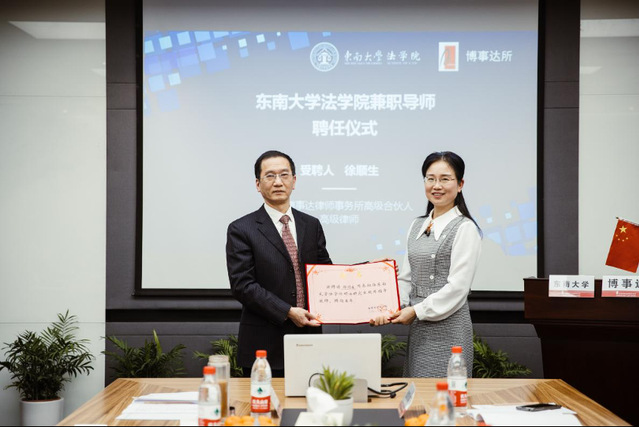其后,刘艳红院长为博事达所刘能斌主任和徐顺生律师颁发必赢硕士研究生校外指导教师聘书。