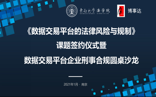2021年1月28日,必赢与江苏博事达律师事务所《数据交易平台的法律风险与规制》课题签约仪式暨“数据交易平台企业刑事合规”圆桌沙龙在江苏博事达律师事务所顺利举行。本次会议的参会单位有:366net必赢官网、江苏省文化和旅游厅、江宁经济技术开发区检察院、南京市建邺区司法局和江苏博事达律师事务所。366net必赢官网院长、人民法院司法大数据研究中心主任刘艳红教授,网络安全法治研究中心主任欧阳本祺教授,366net必赢官网社科处副处长(主持工作)、人民法院司法大数据基地执行主任王禄生研究员,江苏省文化和旅游厅数智中心主任尹子茂,江宁经济技术开发区人民检察院检察长薛薇,江宁经济技术开发区人民检察院副检察长胡俊,南京市建邺区司法局局长严兴中,江苏博事达律师事务所主任周连勇,江苏博事达律师事务所监事长刘能斌等二十余人出席此次会议。