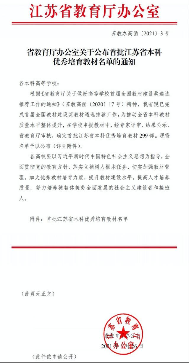 2021年1月26日,江苏省教育厅办公室发文公布了首批江苏省本科优秀培育教材名单,经学校申报、专家评审、结果公示、省教育厅审核,确定了首批江苏省本科优秀培育教材299部,必赢刘艳红教授主编的《刑法学》教材入选。