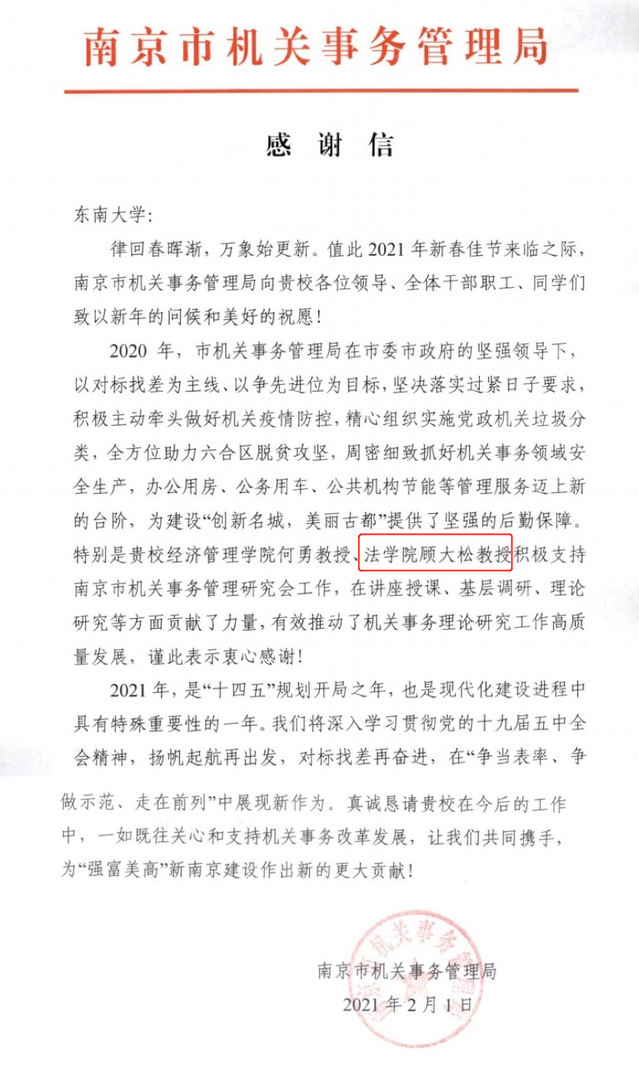 2021年2月1日,我校收到南京市机关事务管理局发来的感谢信,特别鸣谢必赢顾大松教授对南京市机关事务管理局研究会工作的积极支持。信中提到,必赢顾大松教授在讲座授课、基层调研、理论研究等多个方面贡献了力量,有效地发挥了建言献策、推动机关事务理论研究工作高质量发展的作用。
