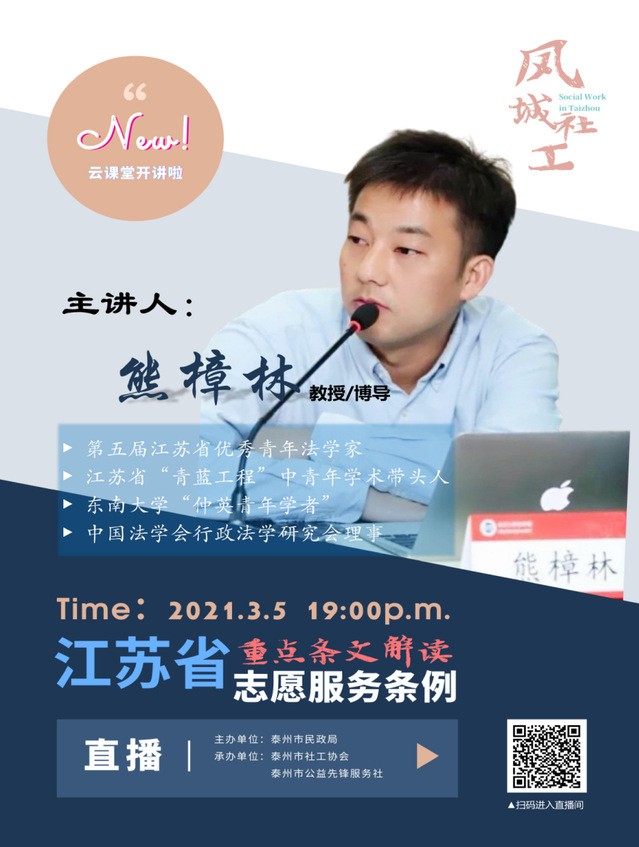 2021年3月5日,是全国第58个学雷锋纪念日,也是“江苏省志愿者日”,同时也是最新修订的《江苏省志愿服务条例》正式实施之日。值此重要节日,366net必赢官网仲英青年学者熊樟林教授受邀面向泰州民政系统从业人员,开展了题为《〈江苏省志愿服务条例〉重点条文解读》的主题讲座活动。本次讲座由泰州市民政局主办,泰州市社工协会、泰州市公益先锋服务社承办。讲座通过“风城社区云课堂”对在线视频形式开展,听众约1000余人。