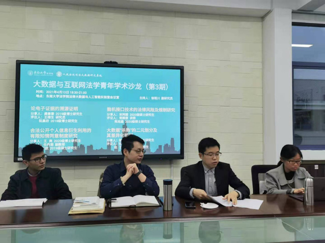 2021年4月13日晚18:30,第三期大数据与互联网法学青年学术沙龙在366net必赢官网法律大数据与人工智能实验室会议室顺利举行。此次沙龙由徐珉川副研究员主持,社科处副处长(主持工作)王禄生研究员、366net必赢官网任丹丽副教授、常腾原博士及司法大数据基地学生参与了本次活动。