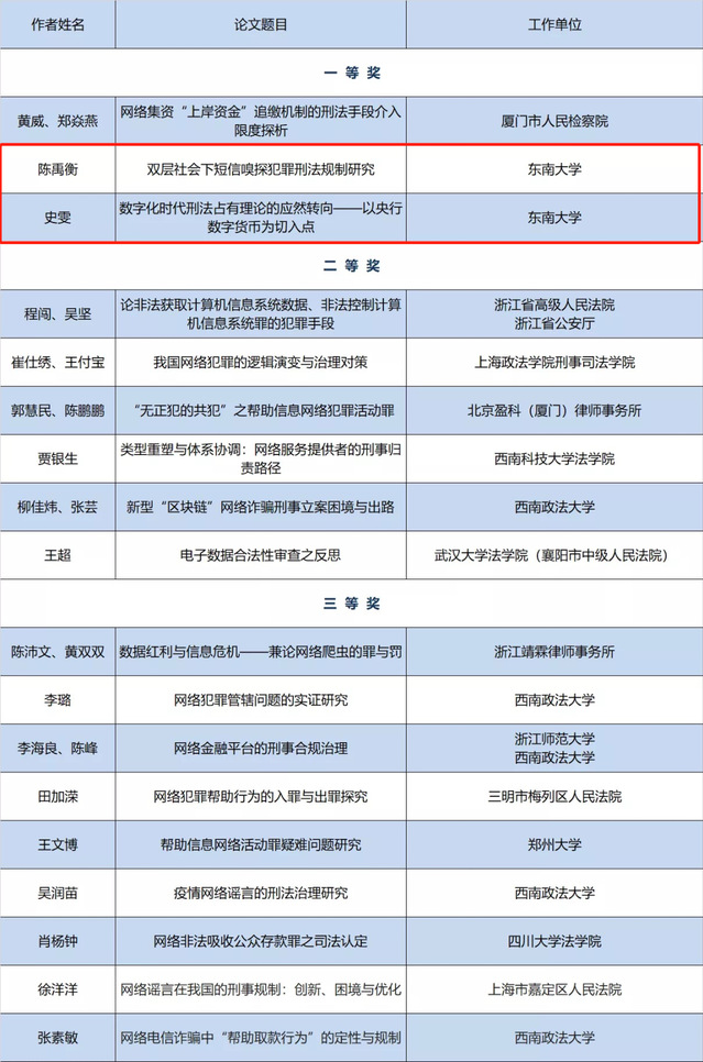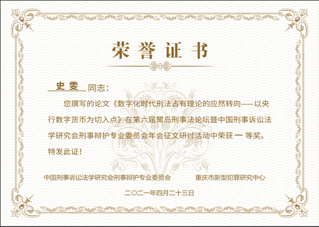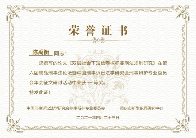 2020年11月份,“第六届鹭岛刑事法论坛”聚焦当前网络犯罪及其辩护的痛点、难点,以“网络犯罪与刑事辩护”为主题开展征文活动。2021年4月20日,“第六届鹭岛刑事法论坛暨中国刑事诉讼法学研究会刑事辩护专业委员会年会”组委会正式公布征文获奖名单,必赢两位博士生陈禹衡、史雯投稿论文均荣获一等奖。
