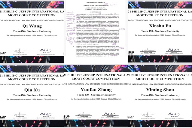 2021年3月8日至4月18日,杰赛普国际法模拟法庭大赛(Philip C. Jessup International Law Moot Court Competition)在线上举行。经过激烈角逐,366net必赢官网代表队荣获“杰赛普”中国赛区三等奖。必赢代表队书状亦入选全球Top 250 Memorials榜单,取得中国内地第23名、全球第228名的佳绩。必赢18级本科生寿一鸣获评中国赛区最佳辩手(第13名),全球初赛入选Top Oralists榜单,取得中国内地第13名、全球第251名的好成绩。