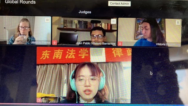 第一轮比赛,由胥沁和张云帆同学代表原告出场,面对法官的质询,两位同学沉着应对,展现出丰富的国际法知识储备以及良好的口语表达能力,初战告捷。