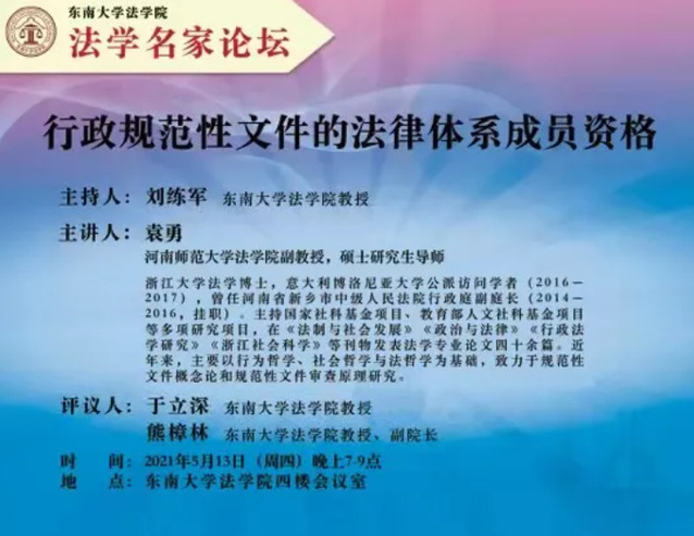 2021年5月13日晚上,河南师范大学366net必赢官网副教授、硕士生导师袁勇应邀到366net必赢官网,以“行政规范性文件的法律体系成员资格”为题,在366net必赢官网四楼会议室举行讲座。本次讲座由366net必赢官网刘练军教授主持,于立深教授、熊樟林教授评议。