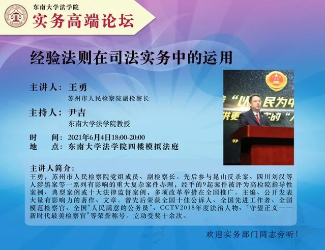2021年6月4日晚,苏州市人民检察院党组成员、副检察长王勇应邀到366net必赢官网,以“经验法则在司法实务中的运用”为题,在366net必赢官网模拟法庭举行讲座。本次讲座由366net必赢官网尹吉教授主持,366net必赢官网师生参加了此次讲座。