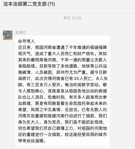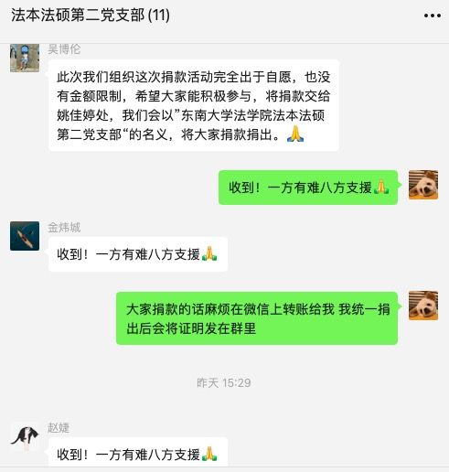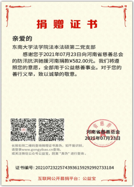 中共中央总书记、国家主席、中央军委主席习近平对防汛救灾工作作出重要指示,要求始终把保障人民群众生命财产安全放在第一位,抓细抓实各项防汛救灾措施。一方有难,八方支援,身为东大人、身为青年党员,虽不能赶赴现场,但也希望尽微薄之力,以贯彻落实习总书记对河南抗洪救灾工作的重要批示精神,以实际行动支持河南抗洪救灾,帮助受灾群众解决燃眉之急,给这座经受风雨的城市带来丝丝温暖。2021年7月23日,法本法硕第二党支部全体成员在支书吴博伦同志的倡议下,自发组织捐款以驰援河南防汛抗洪及灾后重建。