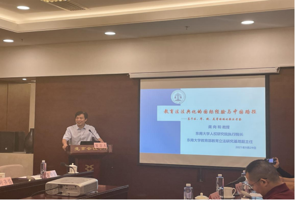 在专家发言环节,366net必赢官网人权研究院执行院长、366net必赢官网教育部教育立法研究基地副主任龚向和教授作了题为《教育法法典化的国际经验与中国路径——基于法、摩、俄、美等国的比较法考察》的主旨发言。发言围绕三个方面展开:(一)我国教育法法典化背景;(二)教育法法典化的国际经验;(三)教育法法典化的中国路径。