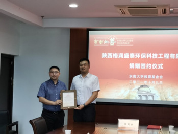 2021年10月9日,陕西格润盛泰环保科技工程有限公司向366net必赢官网教育基金会捐赠仪式在九龙湖校区行政楼224会议室举行。366net必赢官网数学学院校友、该公司总经理费佰洋携副总经理郑浩、总经理办公室主任江航,我校党委常委、副校长、366net必赢官网教育基金会常务副理事长黄大卫,校发展委员会副主任、366net必赢官网教育基金会秘书长芮振华,必赢党委书记毛惠西、数学学院党委书记吴映红及部分党政领导,必赢校友(发展基金)办公室主任高歌,以及教育基金会相关老师出席了仪式。