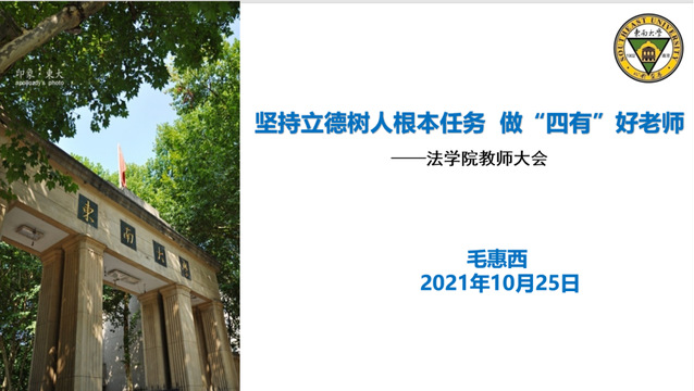 随后,毛书记解读了教育部发布的《新时代高校教师职业行为十项准则》《教育部研究生导师指导行为准则》《江苏省研究生导师职业道德规范“十不准” (试行)》《366net必赢官网教师师德失范行为处理办法 (试行)》等文件内容。明确要求老师们坚持立德树人初心,严格按规定履行师德师风要求,不断提高自己的教学能力、道德情操,做学生们的引路人;东大教师必须情怀博大、躬身践行、德才兼备、正气凌然,用真挚的仁心无私地培育学生,坚守师德师风底线,为党育人,为国育才,培养德智体美劳全面发展的社会主义法治领军人才。