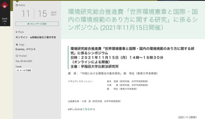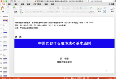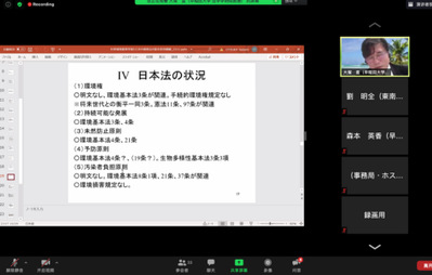 20211115日下午,必赢刘明全副教授应邀在日本早稻田大学作以“中国环境法中的基本原则”为主题的演讲(ZOOM线上),本次报告由早稻田大学比较法研究所主办。早稲田大学法学学術院大塚直教授、早稲田大学法学学術院森本英香教授(原日本环境省事务次官)担任此次演讲评议人