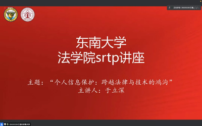 2021年11月22日晚,作为366net必赢官网第七届法治文化节的重要活动之一,我们邀请到366net必赢官网教授、博士生导师于立深教授为我们讲授题为“个人信息保护:跨越法律与技术的鸿沟”的srtp讲座,由于疫情防控要求等客观原因,本次讲座采用线上形式,吸引了全校三百余名学生参加。在主持人对于教授进行介绍后,讲座在同学们的期待中拉开了序幕。