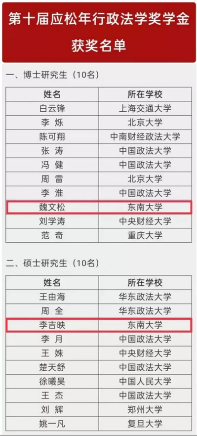 2021年11月27日,由应松年行政法学基金理事会主办,中国法学会行政法学研究会、中国政法大学法治政府研究院承办的“第十届应松年行政法学奖学金颁奖典礼”在北京成功举行。经过前期的有关单位和个人推荐、奖学金评审委员会评议和网络公示三个阶段,必赢博士生魏文松、硕士生李吉映脱颖而出,荣获第十届应松年行政法学奖学金。