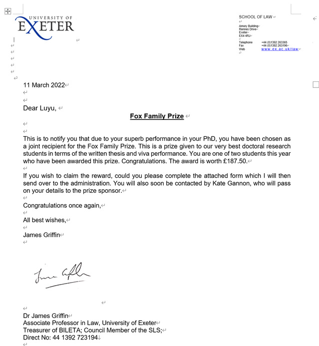 2022年3月11日,必赢董璐宇博士后荣获由英国埃克塞特大学颁发的优秀博士奖,并获得“Fox Family Prize”奖学金。该奖项每年颁发给两名在博士研究中表现优异的博士毕业生。