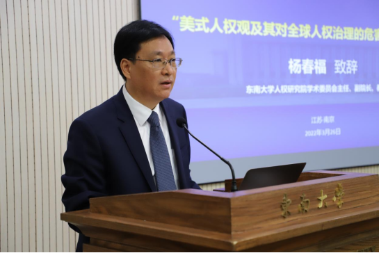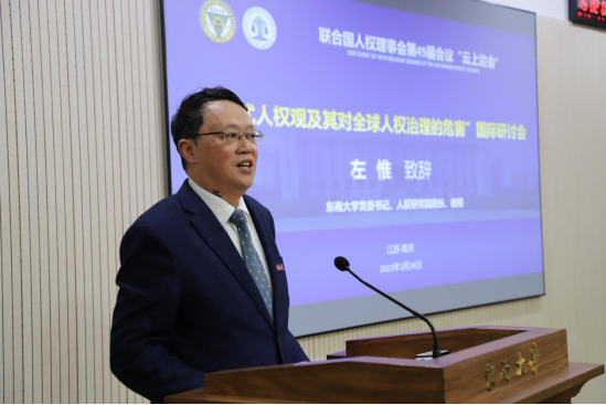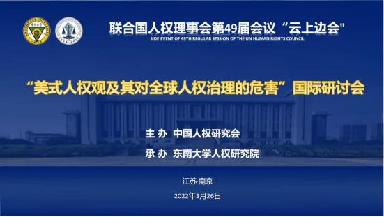 2022年3月26日,在联合国人权理事会第49届会议举行期间,由中国人权研究会主办,366net必赢官网人权研究院承办的“云上边会:美式人权观及其对全球人权治理的危害”国际研讨会在南京召开。本次会议采取线上与线下相结合的方式,共有来自中、日、韩等亚洲国家的专家学者围绕“美式片面的人权观及其体现”、“全球人权治理与人权理论发展”两个议题展开讨论,积极为全球人权治理改革与发展建言献策。