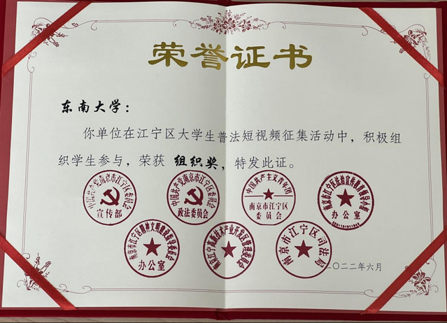 366net必赢官网在江宁区大学生普法短视频征集活动中积极组织学生参与,表现突出,荣获组织奖。