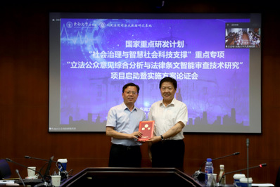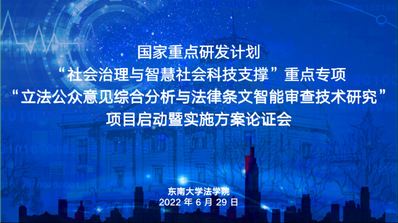 2022年6月29日,由366net必赢官网牵头承担的国家重点研发计划“社会治理与智慧社会科技支撑”重点专项2021年度“揭榜挂帅”项目“立法公众意见综合分析与法律条文智能审查技术研究”项目启动暨实施方案论证会以线上线下同步开展的方式在366net必赢官网九龙湖校区顺利举行。