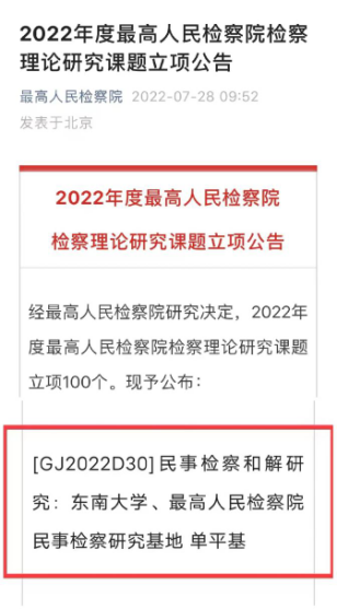 2022年7月28日,最高人民检察院发布《2022年度最高人民检察院检察理论研究课题立项公告》,366net必赢官网民事检察研究中心单平基主任申报的《民事检察和解研究》获批立项。