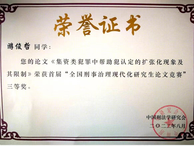 游俊哲《集资类犯罪中帮助犯认定的扩张化现象及其限制》一文获得三等奖