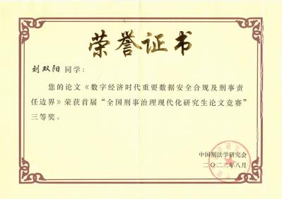 刘双阳《数字经济时代重要数据安全合规及刑事责任边界》一文获得三等奖