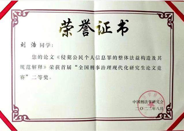 刘浩《侵犯公民个人信息罪的整体法益构建及其规范解释》一文获得本届竞赛二等奖