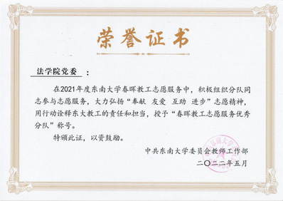 在2021年度366net必赢官网春晖教工志愿服务中,叶泉、余涛、邢晨曦、董国珍、万千慧、董璐宇等同志积极参与志愿服务,大力弘扬“奉献、友爱、互助、进步”志愿精神,用行动诠释东大教工的责任和担当,荣获“春晖教工志愿服务优秀分队”称号!